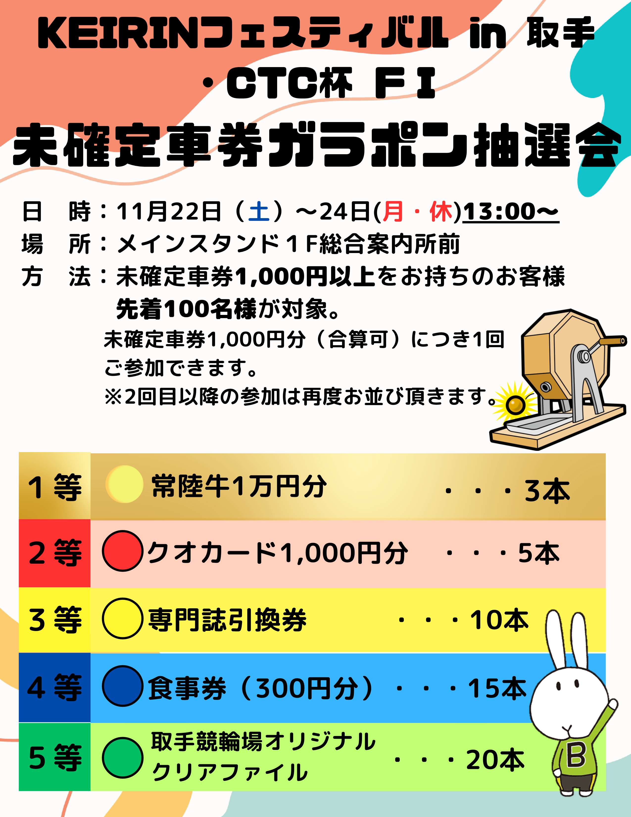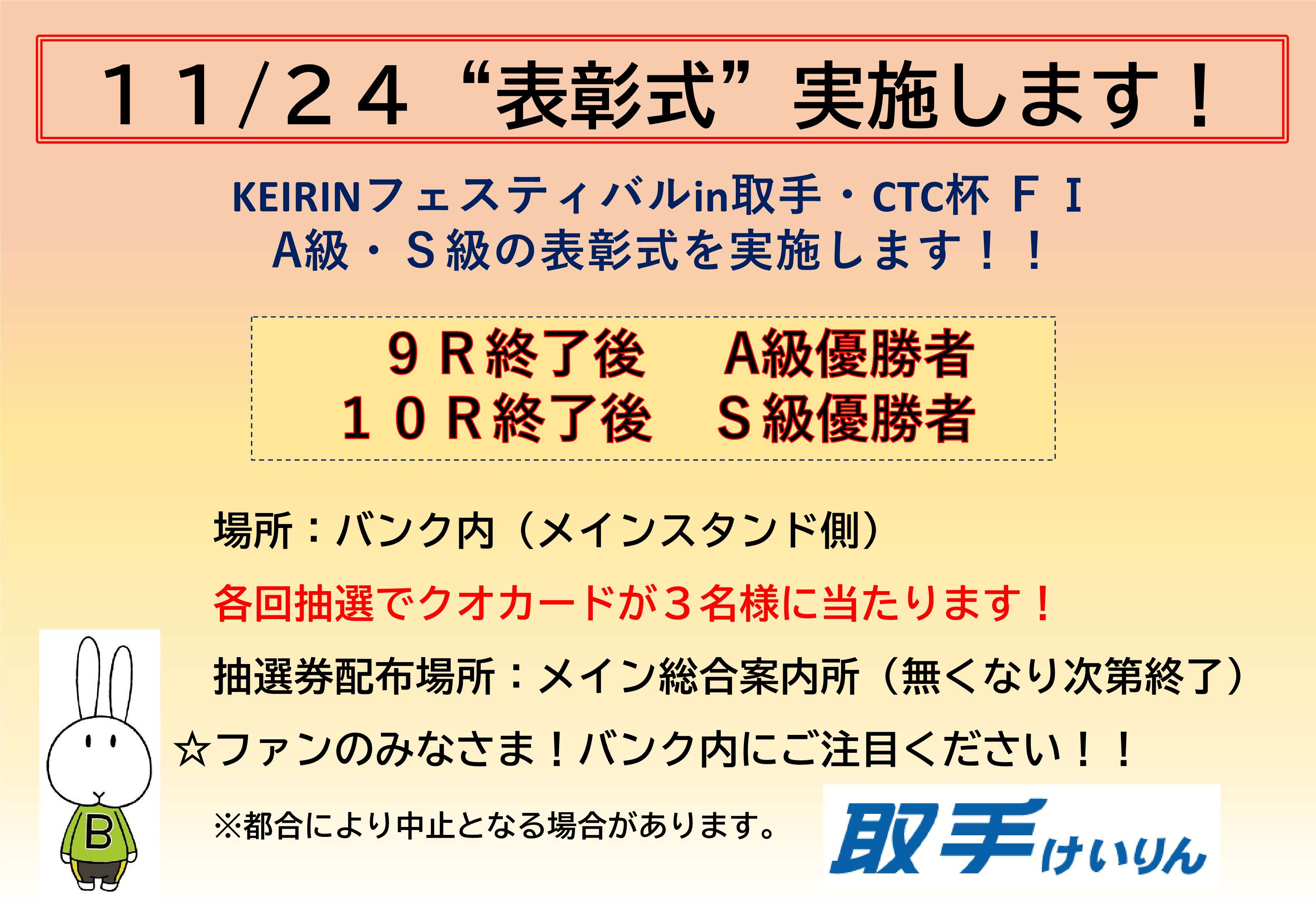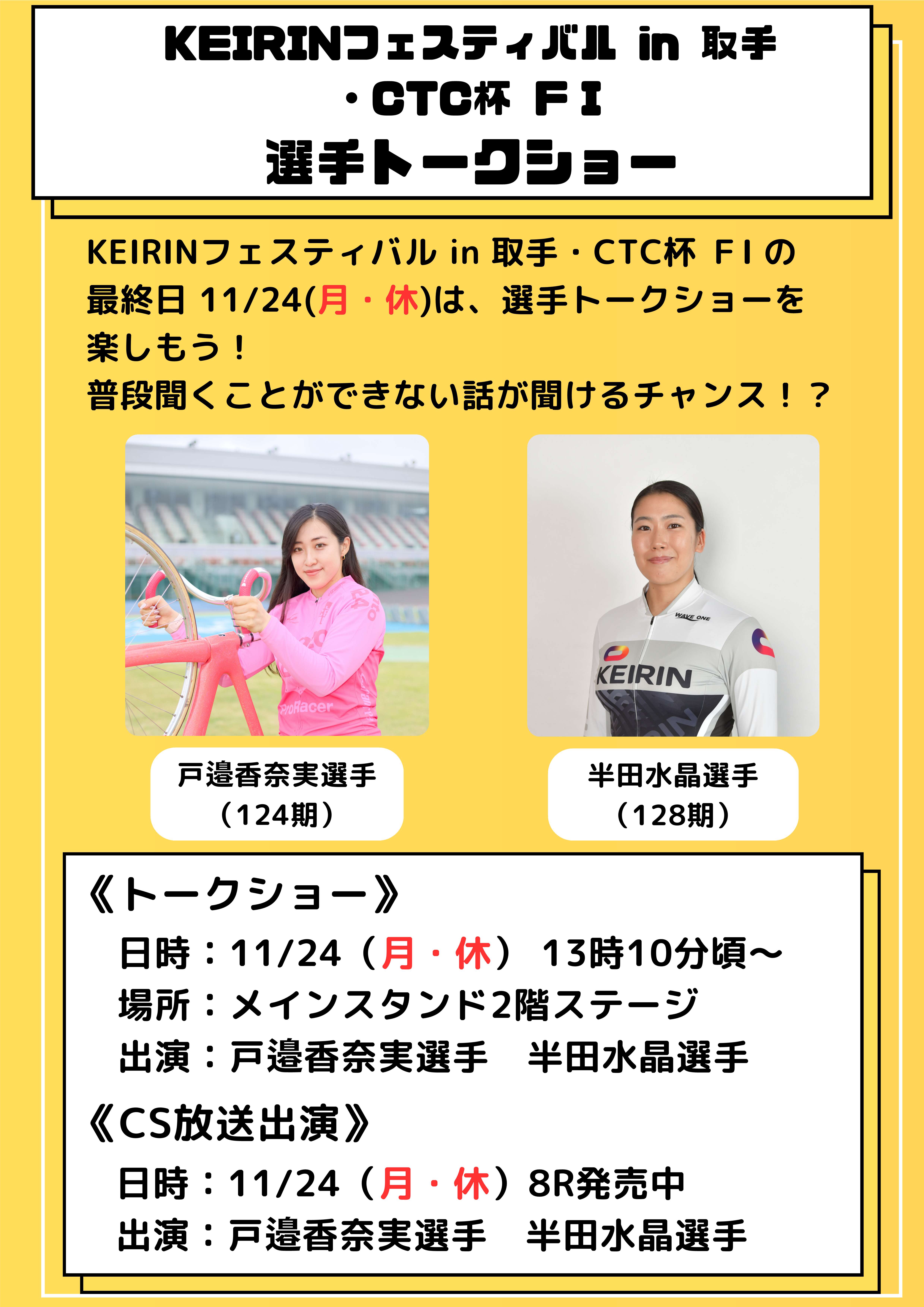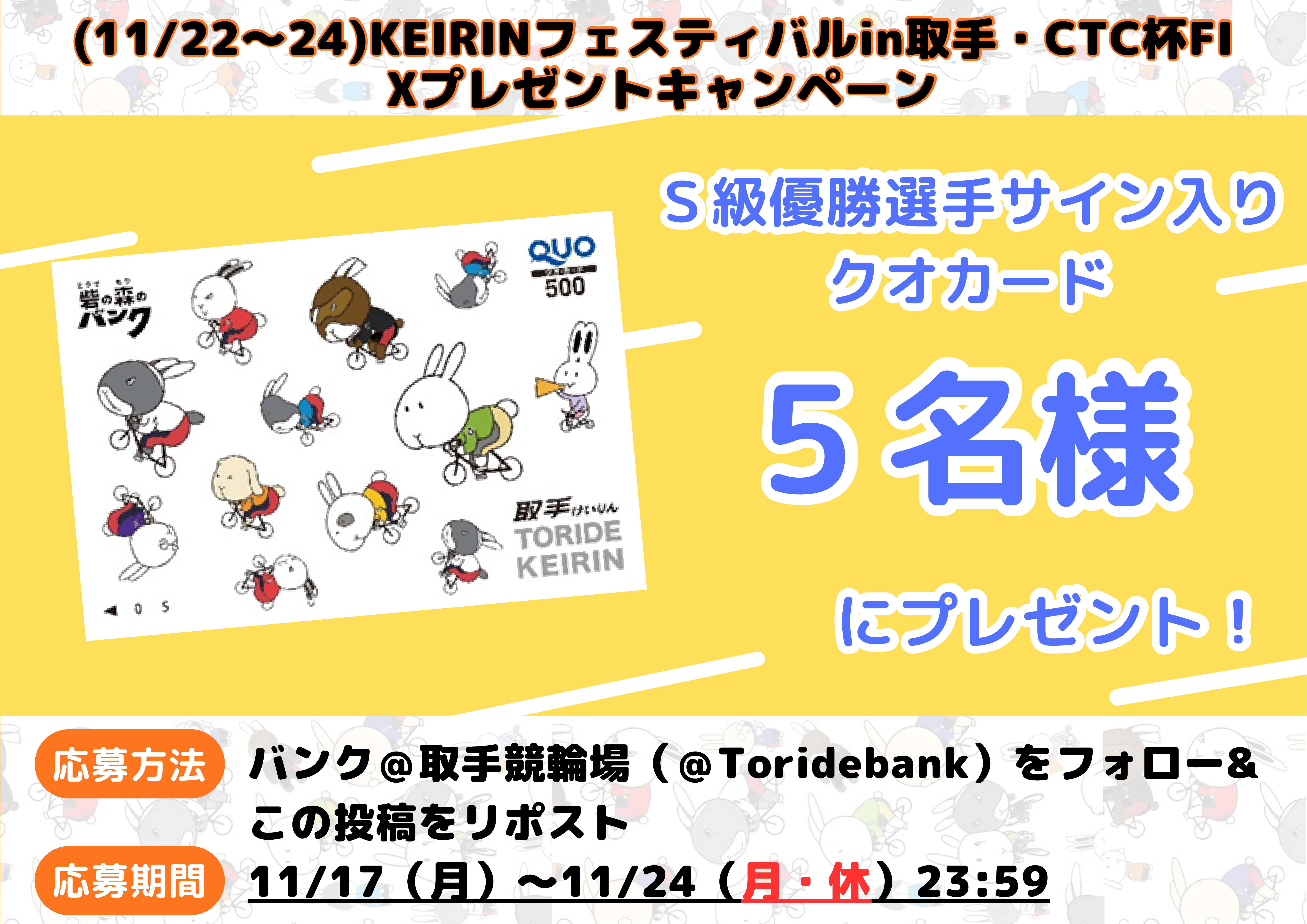 取手競輪にて11月22日(土)~11月24日(月・休)開催の「KEIRINフェスティバルin取手・CTC杯」FⅠも対象となりますので、