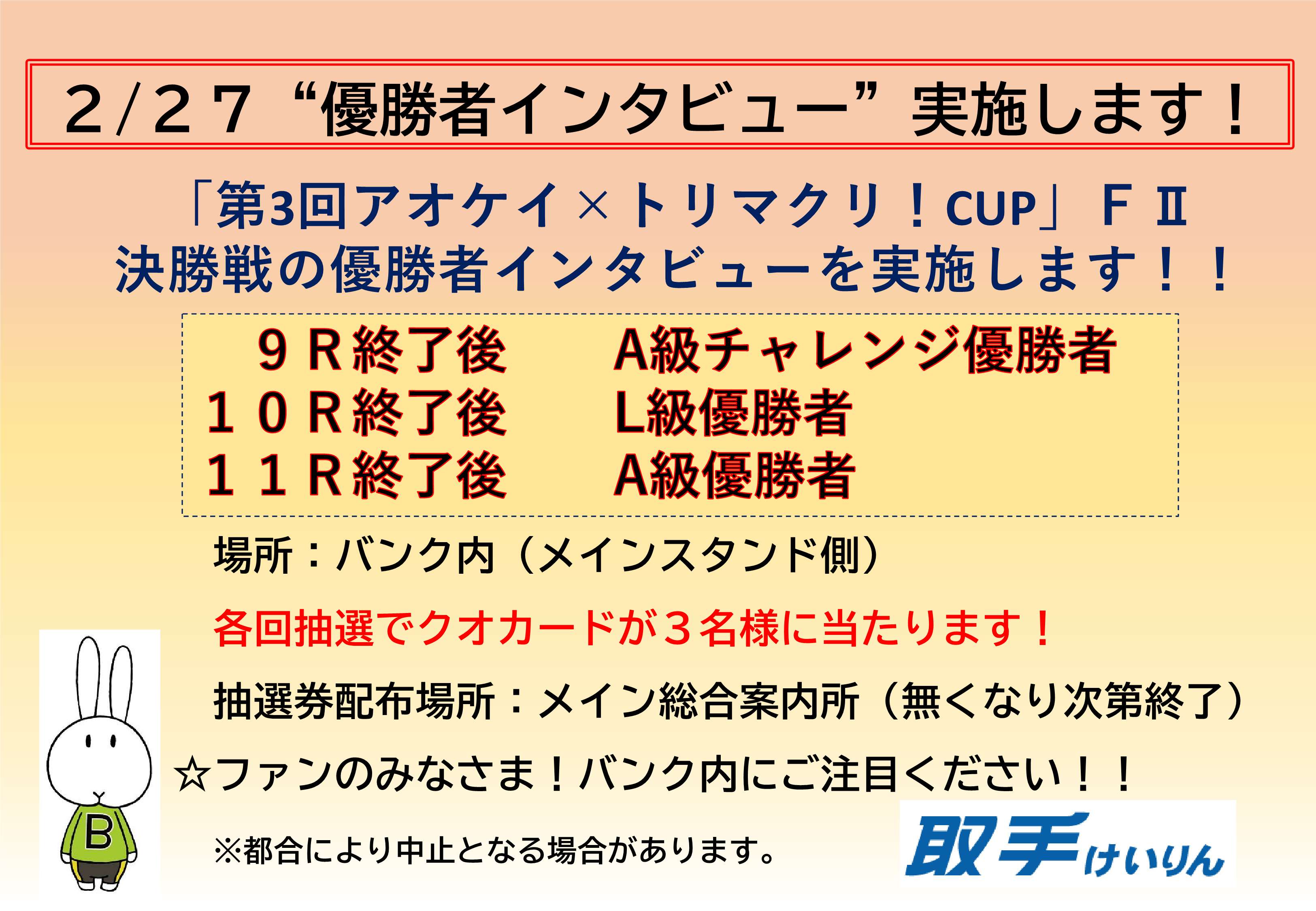 2月25日~27日に開催の「第3回アオケイ×トリマクリ!CUP」FⅡの9・10・11R終了後、A級チャレンジ戦・L級戦・A級1・2班戦の
