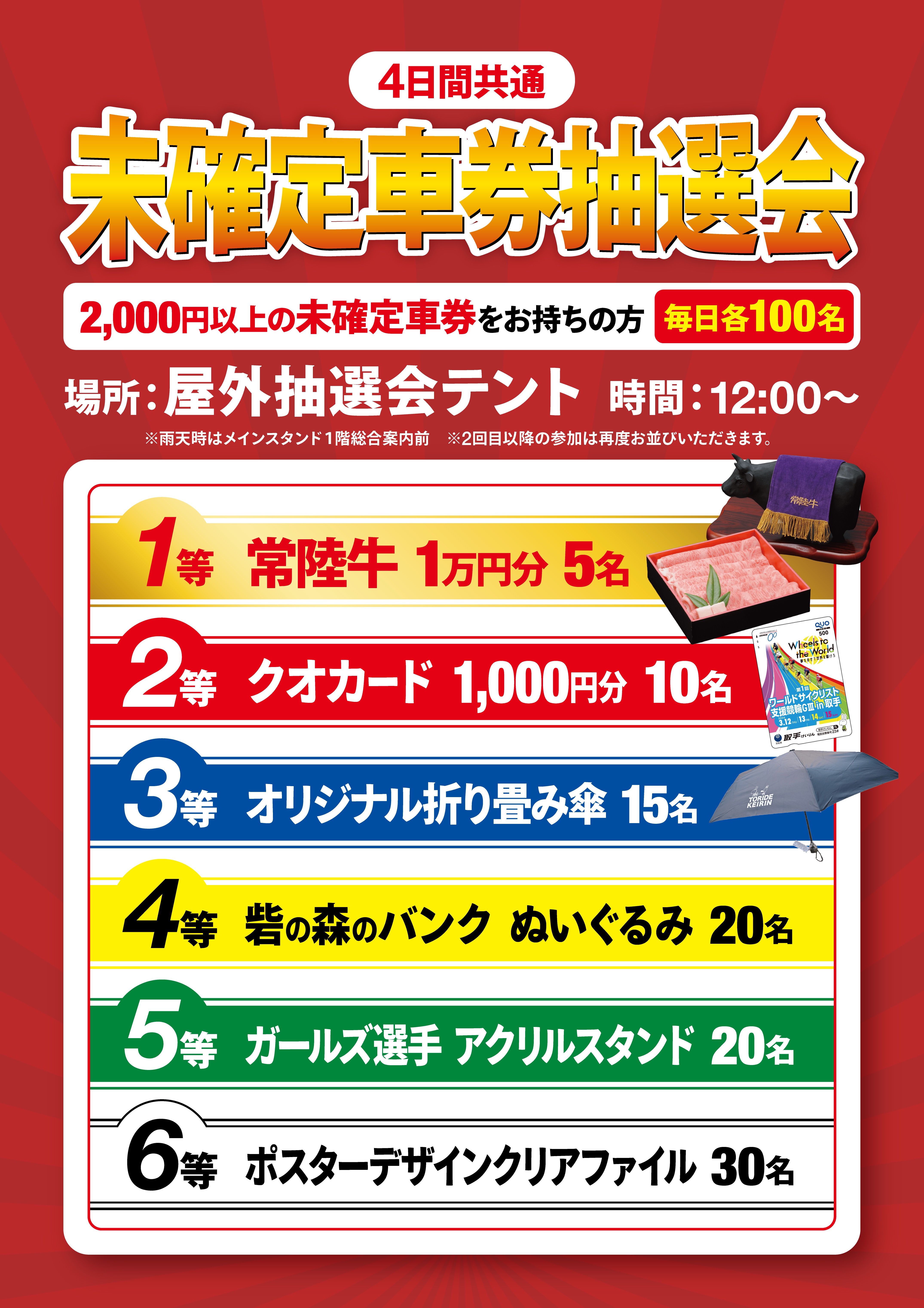 方法:未確定車券2,000円以上をお持ちの方先着100名様にガラポン抽選会を実施!
