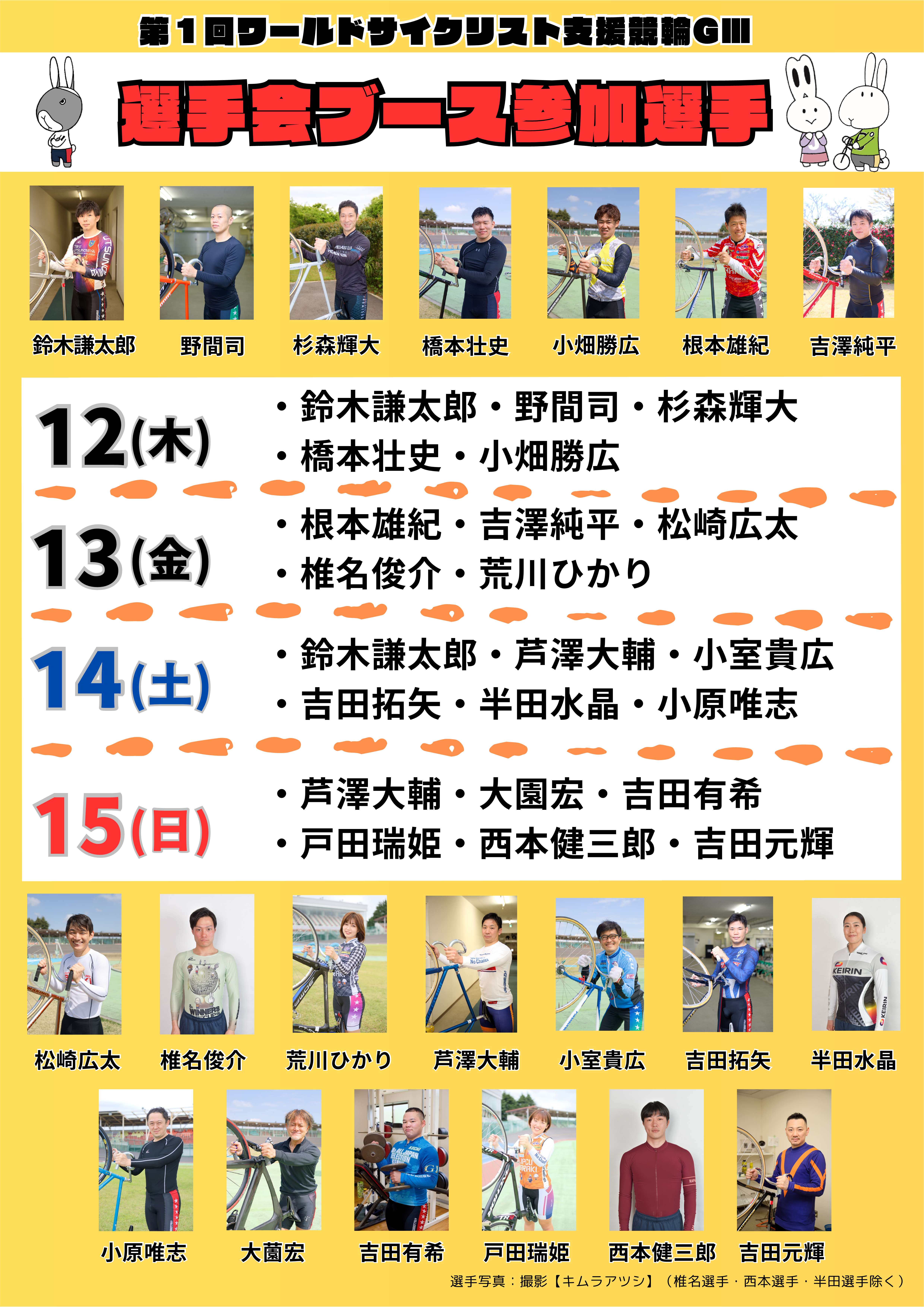 3月12日(木)から開催する第1回ワールドサイクリスト支援競輪GⅢ開催期間中、メインスタンド前テントにて茨城選手会ブースを出展します!