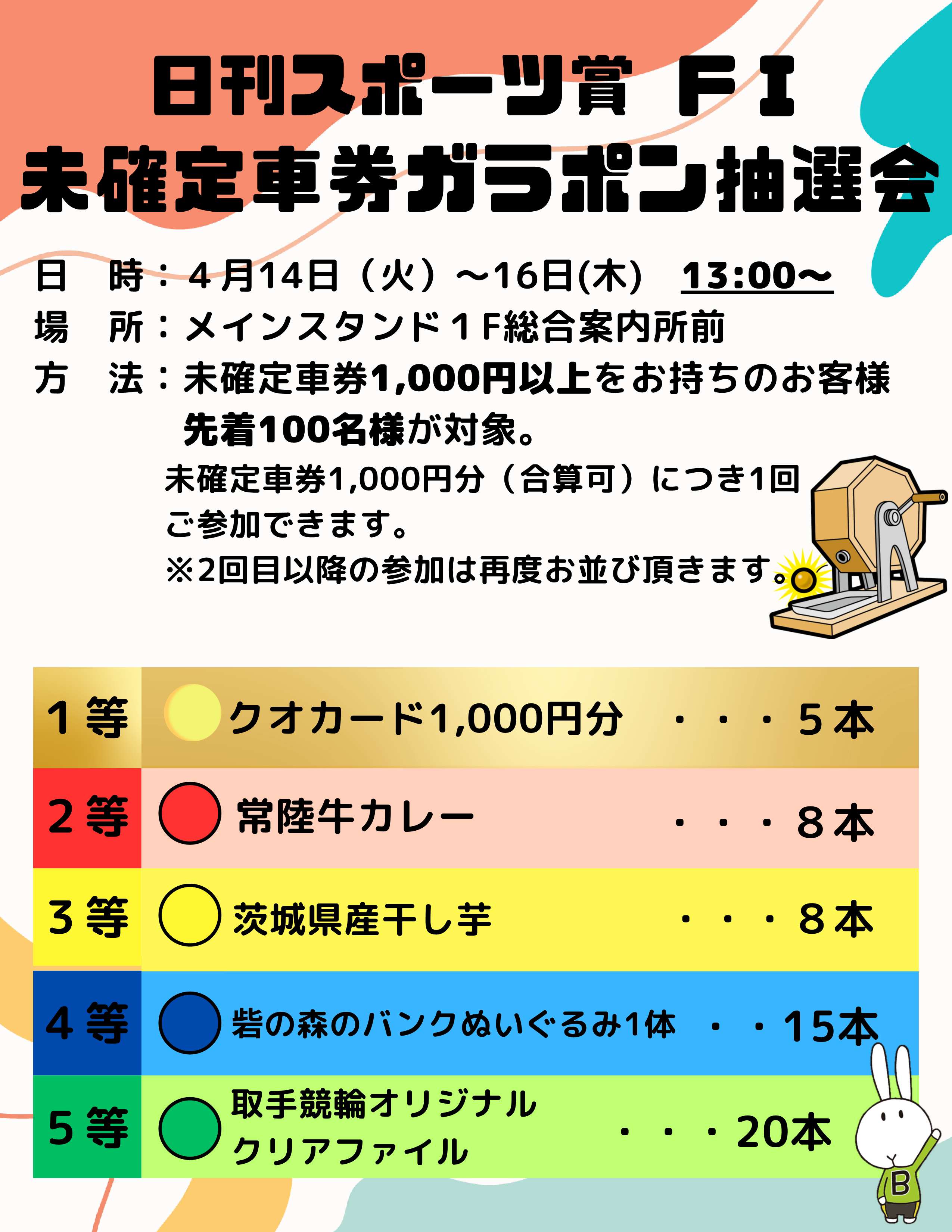 メインスタンド未確定車券ガラポン抽選会を実施します! (日刊スポーツ賞FⅠ 4月14日~16日)