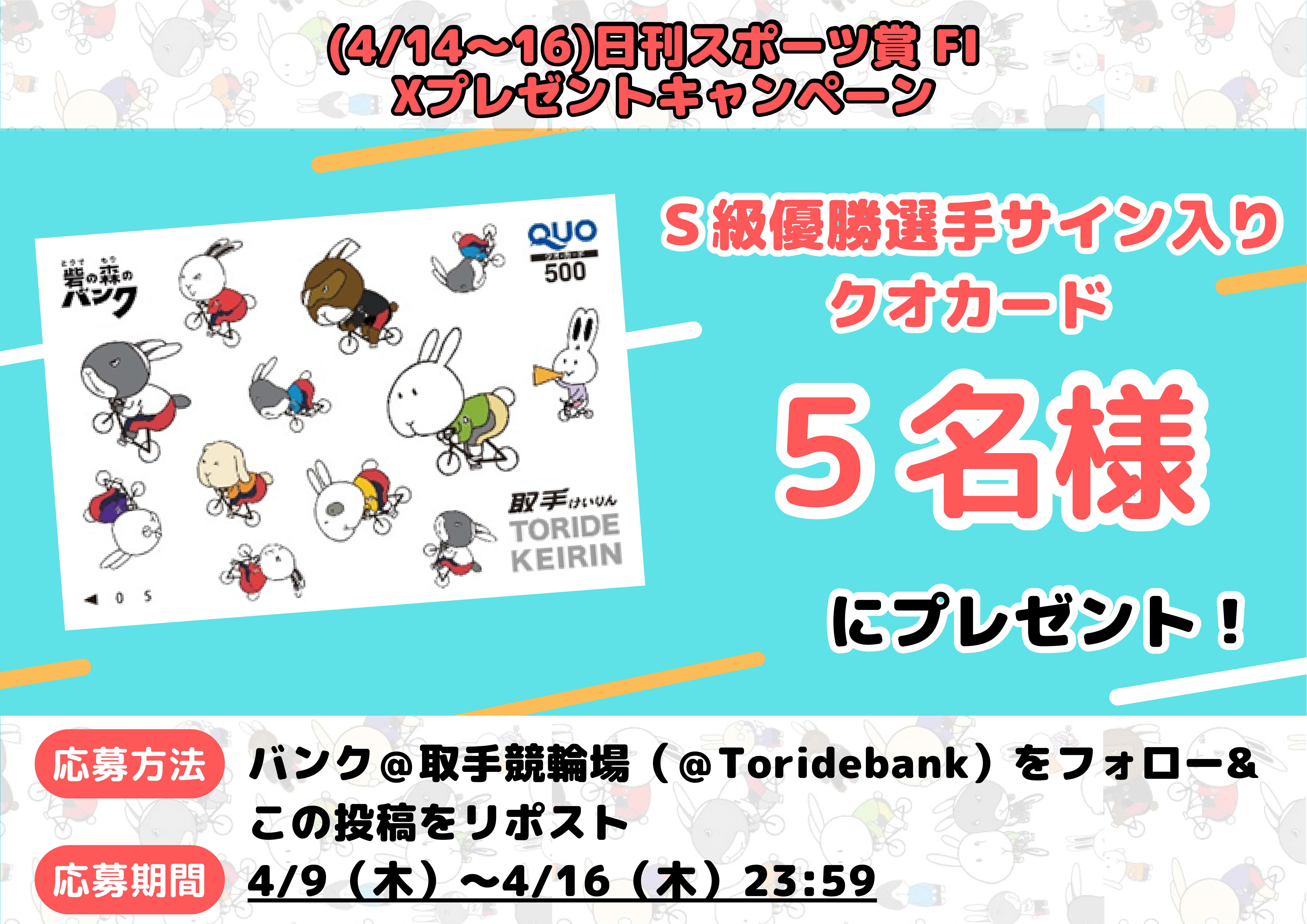 取手競輪公式Xでは、「S級優勝選手サイン入りクオカード」が5名様に当たるプレゼントキャンペーンを実施します!