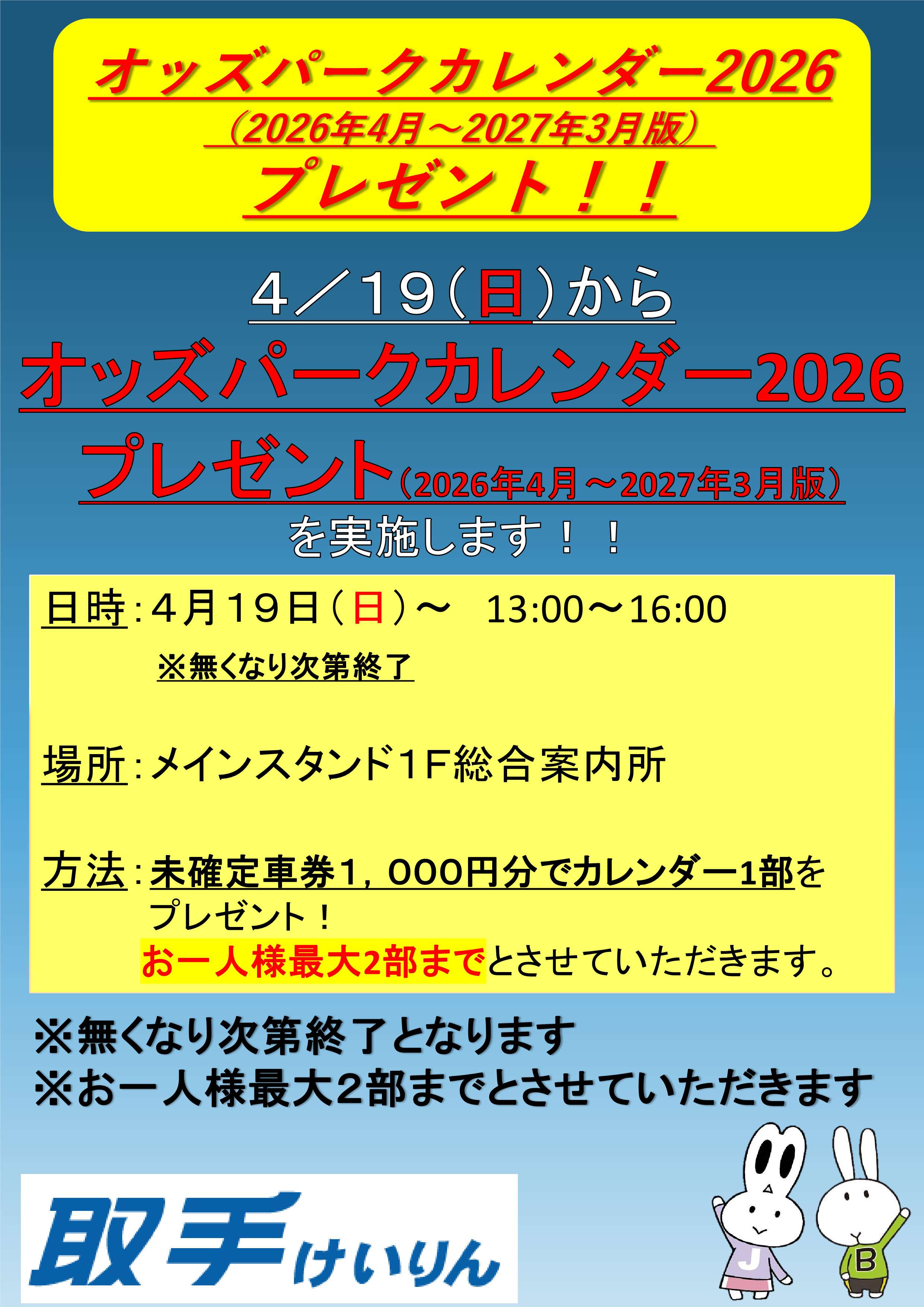 未確定車券1,000円分をご提示でカレンダー1部プレゼント。